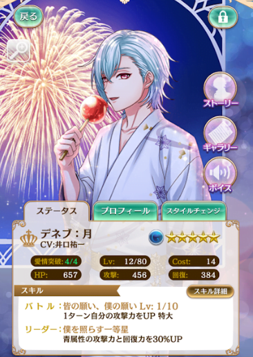 2018年の夢100七夕イベントは「君と見る星花火」。 隠星期と呼ばれるこの時期は、星祭りをノーザンクロスで開催する習わしとなっているそうで、デネブが主催する星祭りの様子が描かれています! そして、イベントクエストでゲットできる☆4王子がデネブです。 2年ぶりの浴衣姿だ~♪ 君と見る星花火のデネブ、