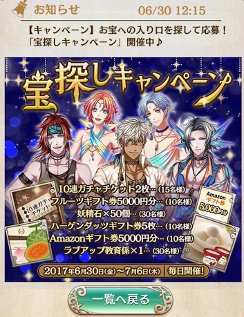 夢100では新イベント「波音が紡ぐ海恋」にあわせて「宝探しキャンペーン」を開催しています! 私もさっそく挑戦してみました! さあ、どんなキャンペーンで何がもらえるのかな~?! ☆おススメ! 無課金で妖精石を大量ゲットする方法☆ ☆簡単に無課金でステラストーンを大量ゲットする方法☆ キャンペーン参加方