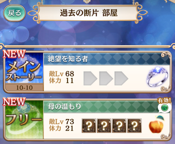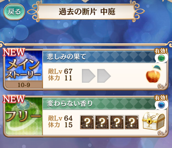 さあ、ついに「過去の断片 客間」までやってきました。 ここで展開されるのは10章3話「記憶の欠片」 「記憶の欠片」のクエストの詳細と対策をお伝えします! ☆おススメ! 無課金で妖精石を大量ゲットする方法☆ 「記憶の欠片」クエスト、こんなメンバーでパーティーを組みました 「記憶の欠片」は全3話。 敵L