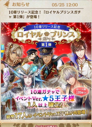 夢100、なんとこんな太っ腹なガチャを開催しています! 「10章リリース記念 ロイヤルプリンスガチャ」 妖精石を50個使う10連ガチャで、★5王子1人確定(←これ、とっても大事) そして過去のイベント王子が再登場というガチャです。 普段、あまりガチャは回さないのですが……「この王子欲しい!!!」とい