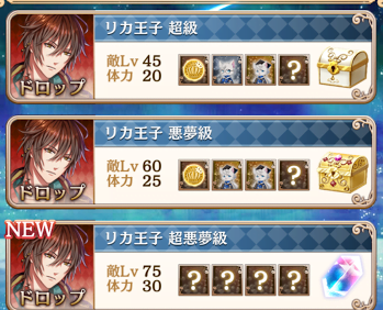 曜日限定ドロップクエストが更新され、新しいドロップ対象王子が発表されました。 12/23~1/22のドロップできる王子は 月曜 サイ 火曜 カノエ 水曜 アディエル 木曜 ユーノ 金曜 リカ という5人。持っていない王子はもちろん、持っている王子もシークレットまで読むために落とす予定です。 さて、今