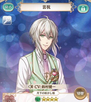 月下の妖かし桜イベントで登場した王子の月覚醒は、月夜の着物姿です。 どの王子も妖しげで儚くてとても綺麗。 ようやく覚醒させた言祝の着物姿も、美しくて見惚れました~! ☆おススメ! 無課金で妖精石を大量ゲットする方法☆ とにかく儚いよね、言祝!! さて、まずは覚醒前の言祝から。 淡いグリーンのベストと