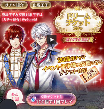 夢100で今行われているのが、妖精石を100個使って20回回せる、ドリームガチャ。 過去のイベント王子が引けるうえ、好きな王子と交換できるチケットがついたガチャなのです。 1人1回しかチャレンジできません! 今回ゲットできる王子の中に、イノセントブライダルのアヴィがいたので、欲しいなあと思ったのです