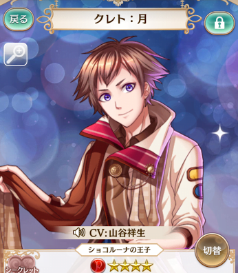 ネタバレあり チョコレートの国の王子様、クレトの月覚醒の育成が終了し、エンディングまで読みました! クレトは王子様らしくかっこよくしようと努めながらも、敬語が苦手だったり照れ屋だったりと、ごく普通の男の子にちかい王子様。 チョコレート……じゃなくて、ショコルーナで行われるチョコレートのコンテストにシ