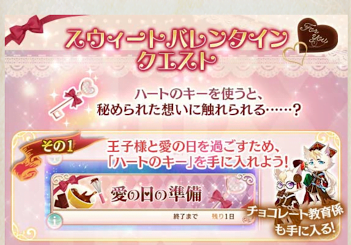 2/14のバレンタインデー。 夢100ではスイートバレンタインクエストというものが行われていて 簡単なクエストでハートのキーを手に入れると 「愛の日をあなたと」を開放できるというクエストです。 「愛の日をあなたと」ではほぼ全ての王子のショートストーリーを読むことができるというもの! ただし解放される