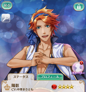 ☆4王子って、実はけっこう魅力的な王子が揃っていると思います。 どうしても☆5王子に目が行きがちですけどね。 今回は、蓬莱の国の夏を司る王子、陽影を覚醒させます! 熱い!熱いよ!!まさにパッションな王子、陽影! まずは覚醒前の陽影から。 日焼けした肌と赤い髪が、まさにパッションな王子ですよね。 けど